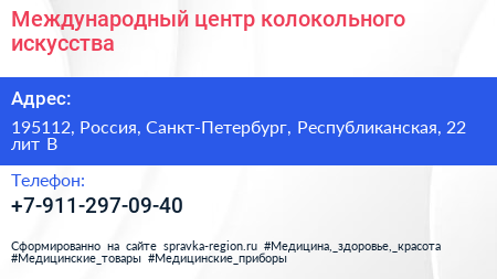Международный центр колокольного искусства по адресу 195112, Россия, Санкт-Петербург, Республиканская, 22 лит В в дальнейшем Организация, размещена в следующих категориях: