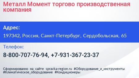 Металл Момент, торгово-производственная компания по адресу 197342, Россия, Санкт-Петербург, Сердобольская, 65 в дальнейшем Организация, размещена в следующих категориях: