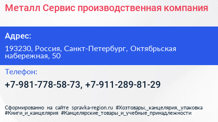 Металл-Сервис, производственная компания по адресу 193230, Россия, Санкт-Петербург, Октябрьская набережная, 50 в дальнейшем Организация, размещена в следующих категориях: