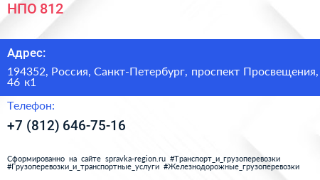 НПО 812 по адресу 194352, Россия, Санкт-Петербург, проспект Просвещения, 46 к1 в дальнейшем Организация, размещена в следующих категориях: