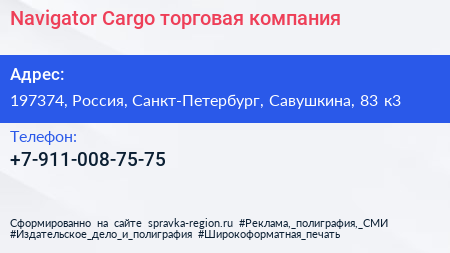 Navigator Cargo, торговая компания по адресу 197374, Россия, Санкт-Петербург, Савушкина, 83 к3 в дальнейшем Организация, размещена в следующих категориях: