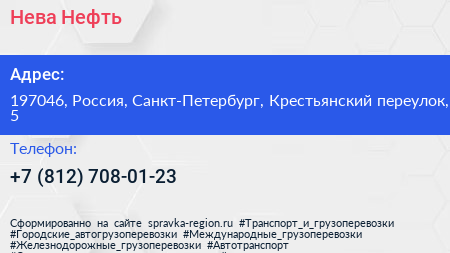 Нева-Нефть по адресу 197046, Россия, Санкт-Петербург, Крестьянский переулок, 5 в дальнейшем Организация, размещена в следующих категориях:
