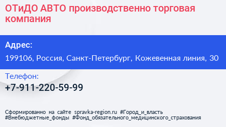 ОТиДО АВТО, производственно-торговая компания по адресу 199106, Россия, Санкт-Петербург, Кожевенная линия, 30 в дальнейшем Организация, размещена в следующих категориях: