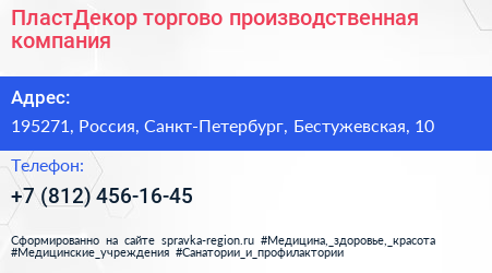 ПластДекор, торгово-производственная компания по адресу 195271, Россия, Санкт-Петербург, Бестужевская, 10 в дальнейшем Организация, размещена в следующих категориях: