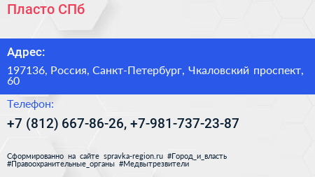 Пласто СПб по адресу 197136, Россия, Санкт-Петербург, Чкаловский проспект, 60 в дальнейшем Организация, размещена в следующих категориях: