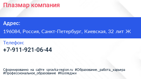 Плазмар, компания по адресу 196084, Россия, Санкт-Петербург, Киевская, 32 лит Ж в дальнейшем Организация, размещена в следующих категориях: