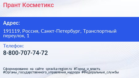 Прант-Косметикс по адресу 191119, Россия, Санкт-Петербург, Транспортный переулок, 1 в дальнейшем Организация, размещена в следующих категориях:
