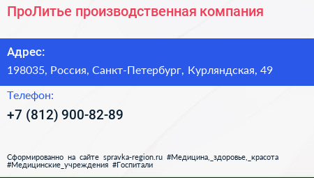 ПроЛитье, производственная компания по адресу 198035, Россия, Санкт-Петербург, Курляндская, 49 в дальнейшем Организация, размещена в следующих категориях: