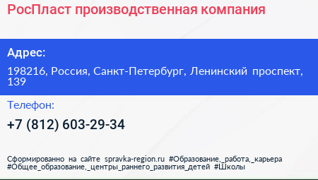 РосПласт, производственная компания по адресу 198216, Россия, Санкт-Петербург, Ленинский проспект, 139 в дальнейшем Организация, размещена в следующих категориях: