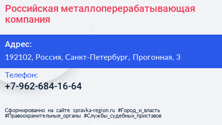 Российская металлоперерабатывающая компания по адресу 192102, Россия, Санкт-Петербург, Прогонная, 3 в дальнейшем Организация, размещена в следующих категориях: