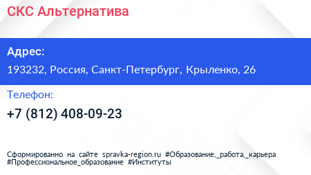 СКС Альтернатива по адресу 193232, Россия, Санкт-Петербург, Крыленко, 26 в дальнейшем Организация, размещена в следующих категориях: