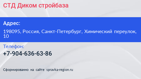 СТД Диком, стройбаза по адресу 198095, Россия, Санкт-Петербург, Химический переулок, 10 в дальнейшем Организация, размещена в следующих категориях: