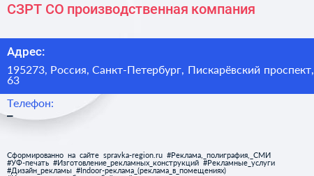 СЗРТ СО, производственная компания по адресу 195273, Россия, Санкт-Петербург, Пискарёвский проспект, 63 в дальнейшем Организация, размещена в следующих категориях: