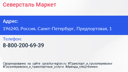 Северсталь Маркет по адресу 196240, Россия, Санкт-Петербург, Предпортовая, 1 в дальнейшем Организация, размещена в следующих категориях: