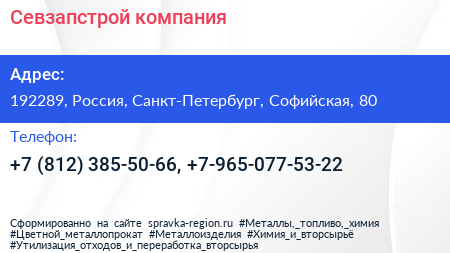Севзапстрой, компания по адресу 192289, Россия, Санкт-Петербург, Софийская, 80 в дальнейшем Организация, размещена в следующих категориях: