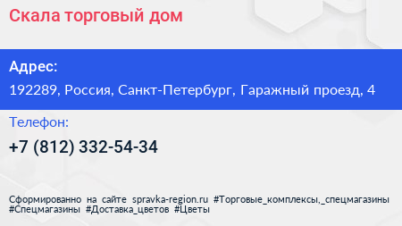 Скала, торговый дом по адресу 192289, Россия, Санкт-Петербург, Гаражный проезд, 4 в дальнейшем Организация, размещена в следующих категориях: