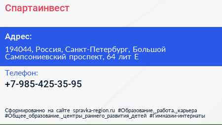 Спартаинвест по адресу 194044, Россия, Санкт-Петербург, Большой Сампсониевский проспект, 64 лит Е в дальнейшем Организация, размещена в следующих категориях: