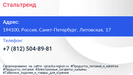 Стальтренд по адресу 194100, Россия, Санкт-Петербург, Литовская, 17 в дальнейшем Организация, размещена в следующих категориях: