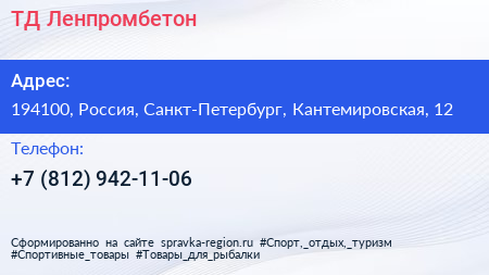 ТД Ленпромбетон по адресу 194100, Россия, Санкт-Петербург, Кантемировская, 12 в дальнейшем Организация, размещена в следующих категориях: