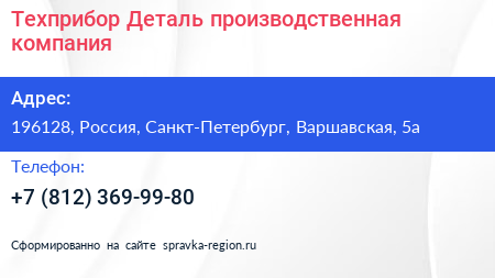 Техприбор-Деталь, производственная компания по адресу 196128, Россия, Санкт-Петербург, Варшавская, 5а в дальнейшем Организация, размещена в следующих категориях: