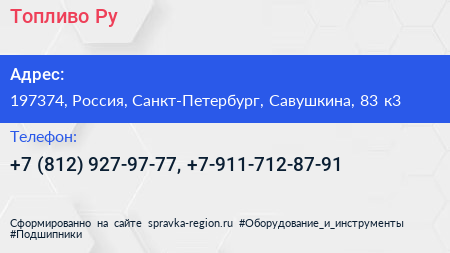 Топливо Ру по адресу 197374, Россия, Санкт-Петербург, Савушкина, 83 к3 в дальнейшем Организация, размещена в следующих категориях: