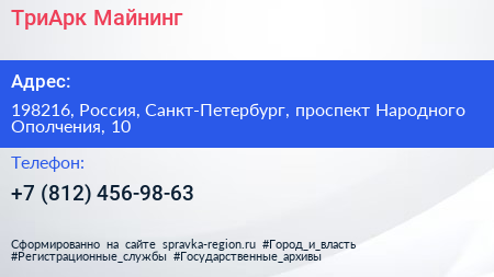 ТриАрк Майнинг по адресу 198216, Россия, Санкт-Петербург, проспект Народного Ополчения, 10 в дальнейшем Организация, размещена в следующих категориях: