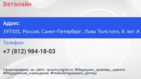 Веталайн по адресу 197101, Россия, Санкт-Петербург, Льва Толстого, 8 лит А в дальнейшем Организация, размещена в следующих категориях: