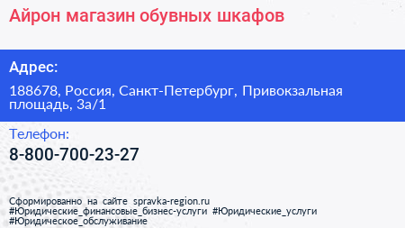 Айрон, магазин обувных шкафов по адресу 188678, Россия, Санкт-Петербург, Привокзальная площадь, 3а/1 в дальнейшем Организация, размещена в следующих категориях: