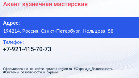 Акант, кузнечная мастерская по адресу 194214, Россия, Санкт-Петербург, Кольцова, 58 в дальнейшем Организация, размещена в следующих категориях: