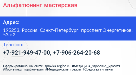 Альфатюнинг, мастерская по адресу 195253, Россия, Санкт-Петербург, проспект Энергетиков, 53 к2 в дальнейшем Организация, размещена в следующих категориях: