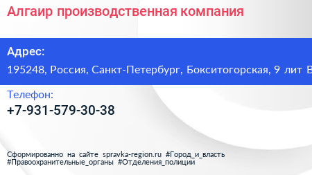 Алгаир, производственная компания по адресу 195248, Россия, Санкт-Петербург, Бокситогорская, 9 лит В в дальнейшем Организация, размещена в следующих категориях: