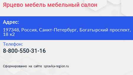 Ярцево мебель, мебельный салон по адресу 197348, Россия, Санкт-Петербург, Богатырский проспект, 18 к2 в дальнейшем Организация, размещена в следующих категориях: