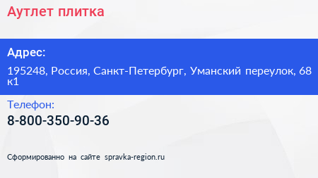 Аутлет плитка по адресу 195248, Россия, Санкт-Петербург, Уманский переулок, 68 к1 в дальнейшем Организация, размещена в следующих категориях:
