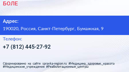 БОЛЕ по адресу 190020, Россия, Санкт-Петербург, Бумажная, 9 в дальнейшем Организация, размещена в следующих категориях: