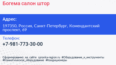 Богема, салон штор по адресу 197350, Россия, Санкт-Петербург, Комендантский проспект, 69 в дальнейшем Организация, размещена в следующих категориях: