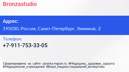 Bronzastudio по адресу 195030, Россия, Санкт-Петербург, Химиков, 2 в дальнейшем Организация, размещена в следующих категориях: