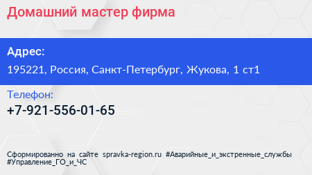 Домашний мастер, фирма по адресу 195221, Россия, Санкт-Петербург, Жукова, 1 ст1 в дальнейшем Организация, размещена в следующих категориях: