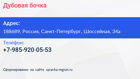 Дубовая бочка по адресу 188689, Россия, Санкт-Петербург, Шоссейная, 34а в дальнейшем Организация, размещена в следующих категориях: