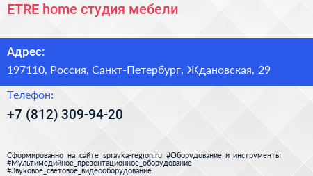 ETRE home, студия мебели по адресу 197110, Россия, Санкт-Петербург, Ждановская, 29 в дальнейшем Организация, размещена в следующих категориях: