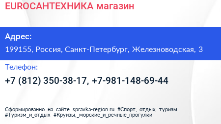 EUROСАНТЕХНИКА, магазин по адресу 199155, Россия, Санкт-Петербург, Железноводская, 3 в дальнейшем Организация, размещена в следующих категориях: