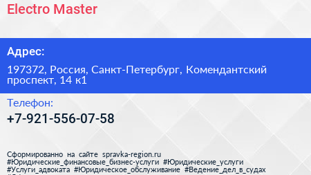 Electro Master по адресу 197372, Россия, Санкт-Петербург, Комендантский проспект, 14 к1 в дальнейшем Организация, размещена в следующих категориях: