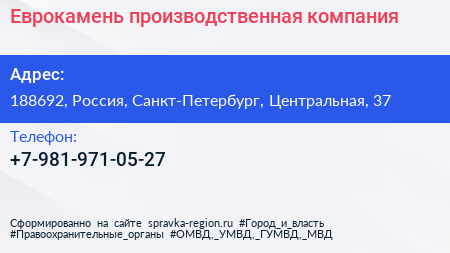 Еврокамень, производственная компания по адресу 188692, Россия, Санкт-Петербург, Центральная, 37 в дальнейшем Организация, размещена в следующих категориях: