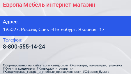 Европа Мебель, интернет-магазин по адресу 195027, Россия, Санкт-Петербург, Якорная, 17 в дальнейшем Организация, размещена в следующих категориях: