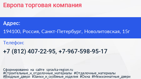 Европа, торговая компания по адресу 194100, Россия, Санкт-Петербург, Новолитовская, 15г в дальнейшем Организация, размещена в следующих категориях: