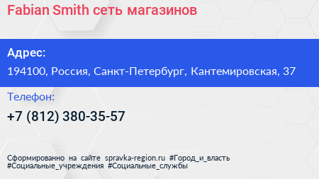 Fabian Smith, сеть магазинов по адресу 194100, Россия, Санкт-Петербург, Кантемировская, 37 в дальнейшем Организация, размещена в следующих категориях: