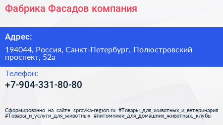Фабрика Фасадов, компания по адресу 194044, Россия, Санкт-Петербург, Полюстровский проспект, 52а в дальнейшем Организация, размещена в следующих категориях:
