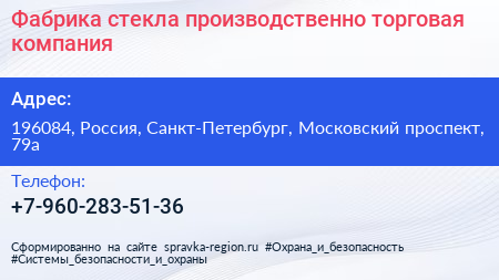 Фабрика стекла, производственно-торговая компания по адресу 196084, Россия, Санкт-Петербург, Московский проспект, 79а в дальнейшем Организация, размещена в следующих категориях:
