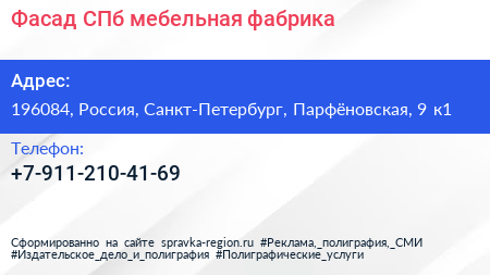 Фасад-СПб, мебельная фабрика по адресу 196084, Россия, Санкт-Петербург, Парфёновская, 9 к1 в дальнейшем Организация, размещена в следующих категориях: