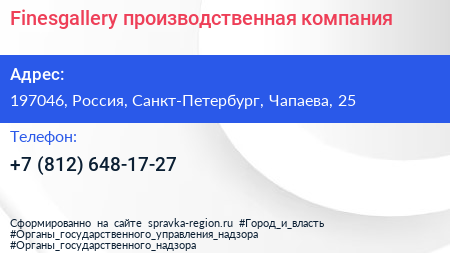 Finesgallery, производственная компания по адресу 197046, Россия, Санкт-Петербург, Чапаева, 25 в дальнейшем Организация, размещена в следующих категориях: