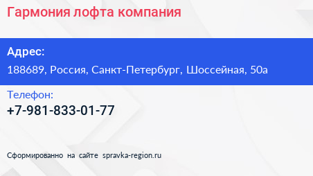 Гармония лофта, компания по адресу 188689, Россия, Санкт-Петербург, Шоссейная, 50а в дальнейшем Организация, размещена в следующих категориях: